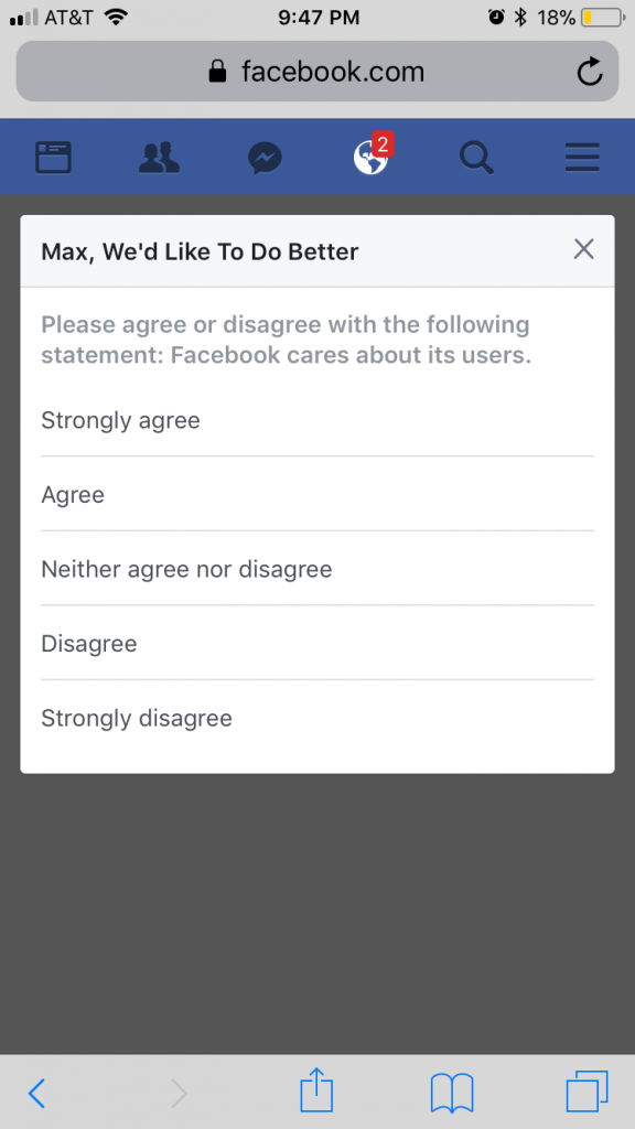 As with Twitter, I don’t the complete data necessary to evaluate Facebook against its mission. At the very least, though, I have evidence that Facebook IS measuring things beyond clicks, engagement, and profit. Here’s a recent survey I received while using the platform: